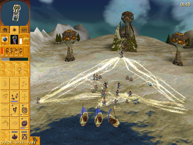 Gone is the open-ended slog of randomly generated maps; in Populous: The Beginning, each level is instead a very manic sort of puzzle. Taking direction not from its direct predecessors but from The Challenge Games (the lesser-known expansion for Populous II), players must divine their way through 25 levels in a single player campaign. Maps range from huge free-for-alls over sprawling archipelagos to small, lonely islands with a single target, in the usual range of warm to freezing climates. Artifacts litter this landscape, culled willy-nilly from world cultures and transmogrified into uncanny inverted images of themselves: Easter Island-style Moais bob their heads like windshield accessories, and vaguely Mayan ‘Vaults of Knowledge’ shimmer with cosmic energy. The former, when worshiped, provide one-off powers that run out after a few charges, while the latter tend to provide a permanent ability or a new building type. There are also Totem Poles and Obelisks – rounding out the game’s hemispheric heist job – which help transform the landscape and give extra spell charges respectively.