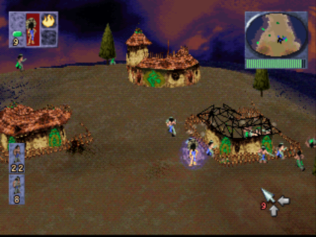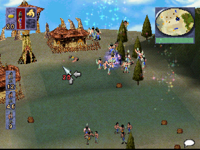 Not much needs to be said about the PlayStation port of The Beginning. It is a demonstrably inferior version of the game, most obviously since players are forced to meticulously comb the landscape with a combination of analog sticks and the D-pad instead of a mouse. Selecting units is a chore and the game lags unforgivably with more than a handful of units on the screen. Other features effectively dumb down the game to an unrecognisable point: Priests convert far faster, Braves multiply at a ridiculous rate, and the Blast spell is now unlimited, making most levels very easy to clear on the first try. Add to this an overwrought, baroque narrator who comments on almost every major action in the game and it is not a pretty picture. Speaking of pictures, the graphics have been distilled to the crunchy, serrated triangles that made the PlayStation famous, and they don’t look very good. This port appears to be a standard cash-in, preying on unsuspecting consumers unaware that it is barely playable.