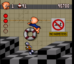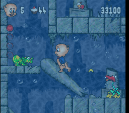 At first Porky can’t do a whole lot more than run and jump, taking out enemies in the typical platformer way of bouncing on their heads. Other than the cupcakes that act as the coin substitutes of the game, power-ups are thin on the ground. Baskets of fruit can be picked up to give Porky a projectile attack and fizzy soda somehow allows him to float. Compared to other platform games of the time, it’s very bare bones.