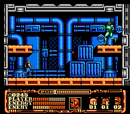 All of the level designs are completely new, and here lies one of Power Blade‘s biggest alterations. The stages in Power Blazer were completely straightforward, but Power Blade allows for much more exploration. Most stages have branching paths and extra rooms to explore, most of which contain power-ups. Additionally, you need to hunt down an informant in each stage, which will allow you to open up the boss door at the end of the level. On one hand, this gives a slightly more open-ended feel than most NES action games. On the other hand, it’s a bit frustrating to get to the end, only to realize that you missed the informant or took the wrong path…or even worse, if you loop around back to the beginning of the stage. Still, these are only annoyances the first time you play, and the stages are never so confusing that you’ll get lost. There is a time limit, but unless you’re playing on the Expert difficulty level, it won’t prove to be an issue.