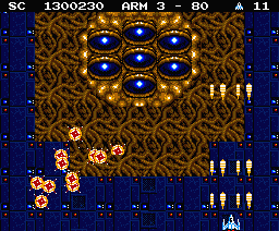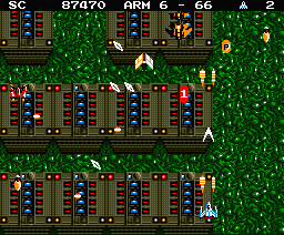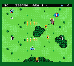 Fundamentally, the game is extremely similar to Zanac. The main difference is that the trio of power-up boxes are gone, instead replaced by tiny ships that drop “P” chips when destroyed. If you collect enough of these, your main cannon will be upgraded. The buildings that dropped the screen-clearing bombs have also been removed. The subweapons have been renumbered from 1-8 (rather than 0-7), and the default weapon, the all-way shot, is the same. However, many of the other subweapons are all new, including a charge gun, which will create a small ball of energy in front of your ship that acts like a shield until you fire it; a ball that rotates your ship to protect yourself from fire; and a wave beam that you can aim. Many of these weapons became staples of subsequent Compile shooters. It also uses the same AI enemy generation system.