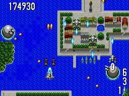 The game plays similarly to the SMS Power Strike, though with some improvements carried forward from Aleste 2, like the ability to choose your starting weapon or change your ship’s speed. Plus it also doesn’t use AI generated enemy patterns, and secondary weapons are infinite. Your main and subweapons are fired together, with the other button used for speed settings, though you can use it to pause, too (activated by a rather helpful setting in the options menu). An interesting addition is a sort of “afterburst” weapon – if you fire continuously for a few seconds then let go of the trigger, you’ll let off a small barrage of powerful wave attacks. There are also spinning orbs to collect – there are three different colors and you can equip two at a time. These affect the strength, speed, and spread of the main weapon, in addition to the power level determined by the P chips.