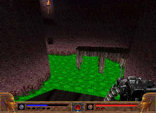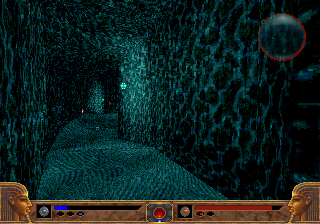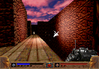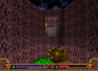 The most distinguishing thing about PowerSlave is its superb graphics, especially considering it was made primarily for the Saturn – a console notorious for being hard to program for and for its difficulty handling 3D games. Utilizing the Slave Driver engine designed by Ezra Dreisbach, the game renders wide open levels in full 3D and manages it without much issue. Though the framerate can dip when there’s a lot happening onscreen, it tends to keep a near-consistent 30fps throughout – making for a very playable game and one of the best running shooters on the Saturn. The only issue is the dark coloring and texturing for the level geometry. While this does help to establish a certain mood, it also makes darker stages like the cave and mine levels near impossible to navigate when the difference between two walls of varying distance is indistinguishable.