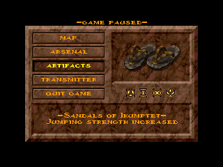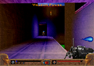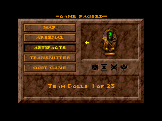 Despite that, the fact that you’re playing through a rearranged campaign should make this port worth experiencing for fans, though they’ll have to live with the loss of grenade jumping, along with the secret minigame Death Tank. As well as sequence breaking, grenade jumping can be used to launch yourself into some pretty wild areas, where you’d find Team Dolls emblazoned with the faces of Lobotomy Software. Collecting every doll unlocks Death Tank, where you and five other players fire missiles at each other much like Scorched Earth, though in real-time. This is missing from the European version of PowerSlave (known as Exhumed), since that came out before Death Tank was programmed, and from the PlayStation port altogether. While you can still collect Team Dolls, they simply unlock ridiculous powers that only serve to find more dolls.