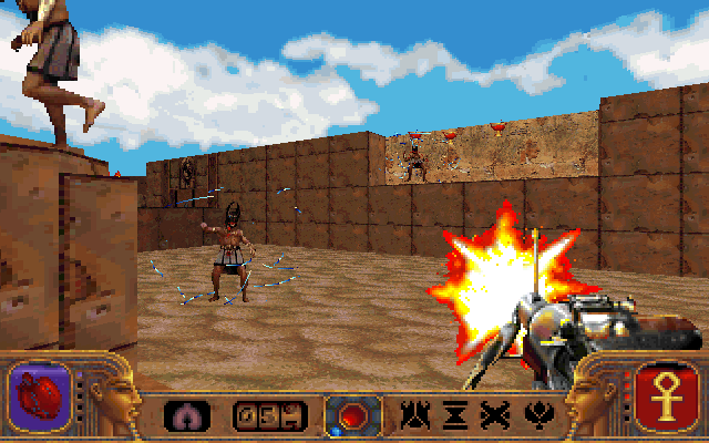 The mid-90s saw many first-person shooters released either trying to emulate or elaborate upon the success of id Software’s DOOM and Wolfenstein 3D, with some of the more memorable examples being created with Ken Silverman’s Build engine (Duke Nukem 3D, Blood, and Shadow Warrior). Among these games is PowerSlave, which was the first original title developed by Lobotomy Software: a team made up of former Nintendo of America and Manley & Associates employees. It was planned to be published by 3D Realms as Ruins: Return of the Gods, until budding publisher Playmates Interactive got the rights to it, necessitating a name-change possibly inspired by the Iron Maiden album Powerslave and a port to the PlayStation and Saturn. Although the PC version of PowerSlave is the original game (despite releasing AFTER the console port), it often gets ignored for that port in most discussions. That’s likely because while it’s a perfectly fine shooter of the era, it isn’t particularly noteworthy save for an extremely glaring flaw.