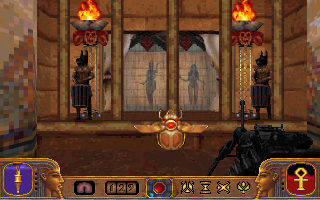 Perhaps the game’s only big deviation from its contemporaries is that it features a checkpoint and lives system. Located at certain points in the level are golden scarabs, which you’ll return to upon dying, but you can only do so a certain number of times – run out of lives and you’ll have to start from the beginning. You start with three lives, but can collect more by finding floating Egyptian men hidden in secret areas (yes, seriously). It’s a cool idea that’s forgiving towards players who forget to save frequently, and dying is usually fine since enemies stay dead and items collected. However, that last point is a big problem in sections where you’ll need ammo or magic in order to progress, which can be severe enough to force you to completely restart the level.