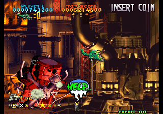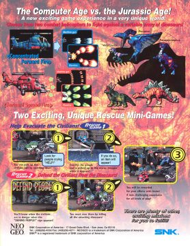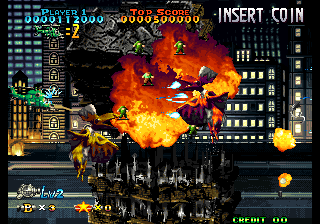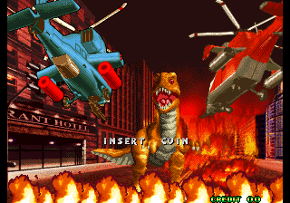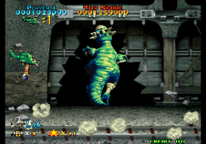 Exactly ten years later, Prehistoric Isle received an arcade sequel for the Neo Geo. It was developed by Saurus, who was previously known for their Shock Troopers run-and-gun series, and published by Yumekobo, who had previously worked on Pulstar and Blazing Star. Just like many sequels that happen several years after their predecessors, this game doesn’t have much to do with the original. For starters, there’s no island, and the dinosaurs are attacking a modern day city, so there isn’t much prehistoric stuff either. Only a couple of stages actually deal with the beasts attacking human settlements though, so it’s not even the Godzilla-esque experience the intro seemed to promise. The biplanes have been replaced by modern attack helicopters, which counts as a plus since shoot-em-ups, and video games in general, that feature choppers are still pretty rare.