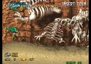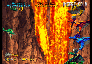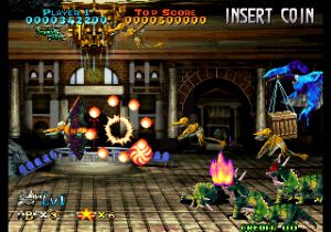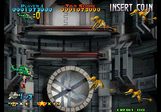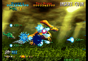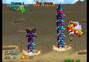 The only thing that this sequel seems to have in common with the earlier game is the presence of a shorter and more linear stage, that ends with an easy boss: the same yellow flying reptile that appeared at the beginning of the first stage, looking intimidating with its fire breath (that it never uses again) but being actually quite dumb and weak. In general, the game seems easier than the first, what with the more powerful weapons and more predictable enemy patterns. It also was turned into a very standard shoot-em-up, removing all the elements that made it stand out. The levels are much more linear and straight-forward. The developers got rid of the multi-purpose pod and replaced it with a more standard weaponry system based on icons that switch between two kinds of power up (straight/spread shot) a la Raiden. One can, though, keep the shoot button pressed and move the lever to change the shot’s orientation.