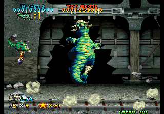 All the graphics are pre-rendered 3D turned into 2D sprites, which was common at the time but looks quite dated today, making all the vehicles and enemies seem like plastic action figures. (“The Computer Age Versus the Jurassic Age!”, proclaims the game’s flyer.) Among them there are a bipedal horned kaiju creature, turquoise sand worms, a fire-breathing dinosaur skeleton that could be a Joe & Mac reject and giant multi-eyed bugs that are yet another homage to the Ohmu from Studio Ghibli’s Nausicaa. To say nothing of the final boss: a squid-like alien monstrosity several screens long that wouldn’t be out of place at the end of a Darius game, but looks especially bizarre here. Don’t worry about another cruel game ending sequence, though… but simply because there’s no end to speak of, only the credits.