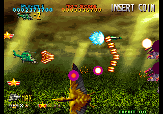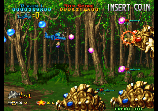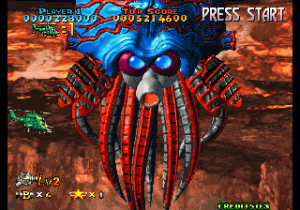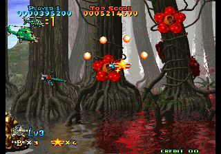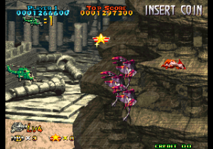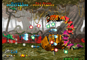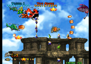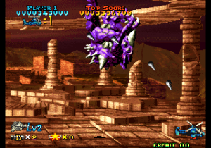 There’s now a secondary shot (various kinds of missiles) and smart bombs have also been added, even if they’re more like very powerful beams. The scoring system has been revamped as well: when the weapon’s level is already maxed out, picking another icon will start a score multiplier that lasts a while, letting players rack up huge amounts of points. Destroying swarms of enemies or big ones also releases star medals, which are counted at the end of a stage for yet another dose of points. A big score bonus is also given for completing a stage without dying.