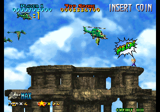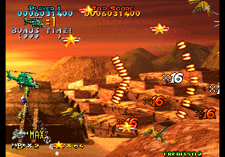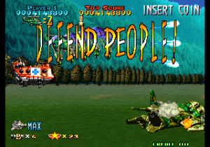 Every now and then you will come across people that need to be rescued by picking them up and carrying them to the Blue Cross helicopters that show up. There are also sequences where the scrolling stops, the command “Defend people!” appears on screen and you have to let these people get on board of the rescue choppers without having them killed by the dinosaurs; in turn, some of the survivors will shower you with weapon, missile and bomb bonuses.