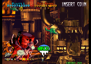 Prehistoric Isle 2 is a campy, goofy title: the booming, wannabe-epic score contrasts with the rainbow-colored reptiles that spit fire, beams, bubbles and energy rings, and the flying enemies that have crates (for power-ups) hanging from their beaks. The people speak with little wacky noises and balloons that say “HELP” in big colorful fonts and “OH NO!” when the helicopter that carries them get destroyed. Everything gives huge amounts of points as well. It’s a decent, if bizarre and repetitive, shooter on its own, but compared to Aicom/Yumekobo’s other shoot-em-ups, it feels pretty underwhelming. It was never ported anyone either, not even as a Virtual Console release, so it’s mostly remained forgotten.