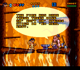 There are still all the bonuses and bonus stages from Prehistorik 2, as well as the end-level tally; this time however it’s not just for score, since getting enough points means gaining extra lives, and the game becomes challenging fast so you’ll need them. Also, the village chief will either berate or congratulate Sam after the tally depending on the percent of items collected. Unfortunately, for such a long game, there still aren’t passwords or save states: the only way to save progress (and only in some levels) is to find the Shopkeeper hidden somewhere in the levels and pay a hefty sum of bones collected from defeated enemies. However not only having to find the shop and paying it is cumbersome, but the progress is only saved in the current gaming session, meaning that you will still have to complete the whole game in a single session. The Shopkeeper also randomly sells more continues, hints on the levels’ secret areas, the opportunity to outright skip a level or funny but useless trivia about Sam’s world and its inhabitants. Just like Prehistorik 2, there are two difficulty levels, but playing on Easy will cut the game short at level 14.