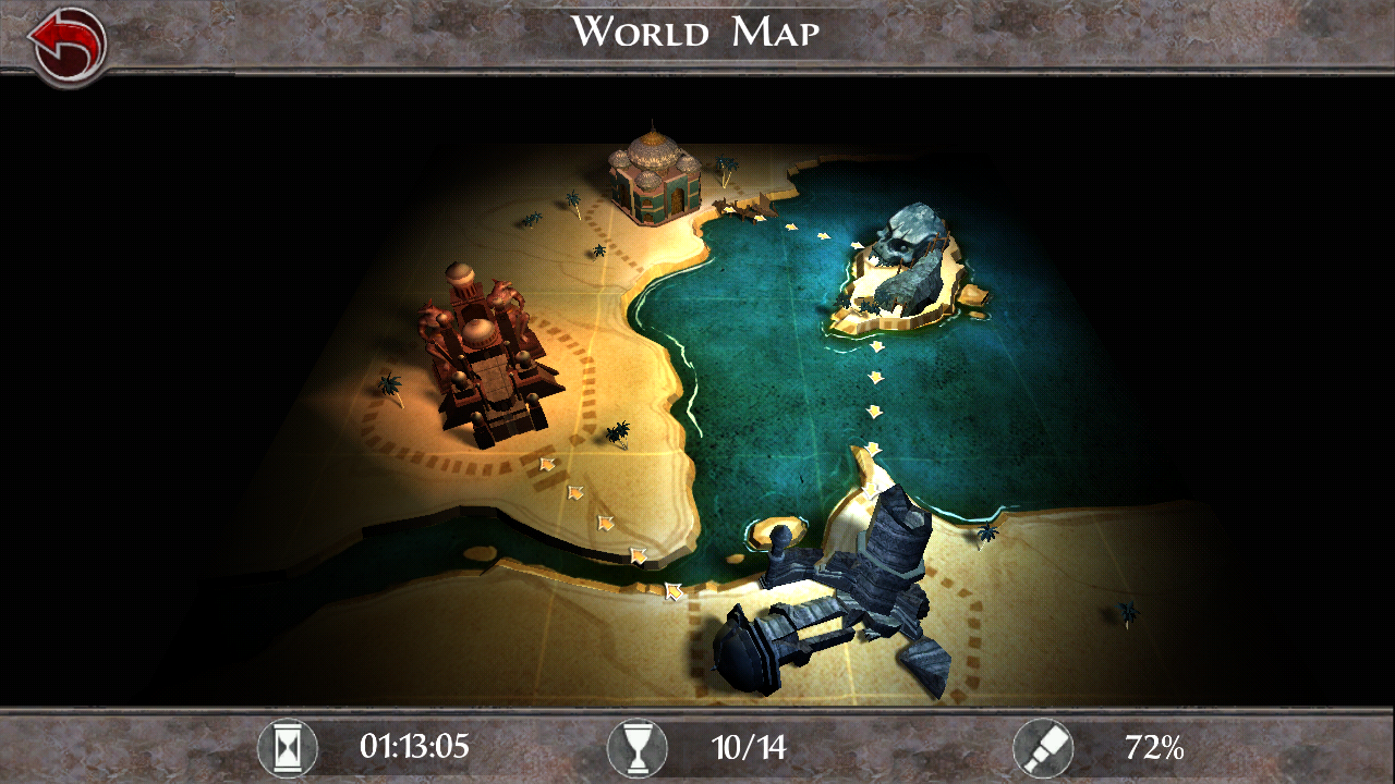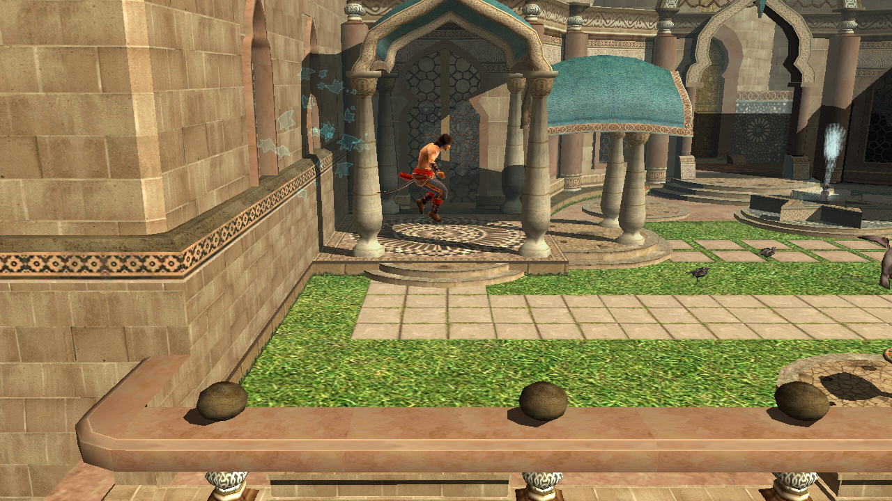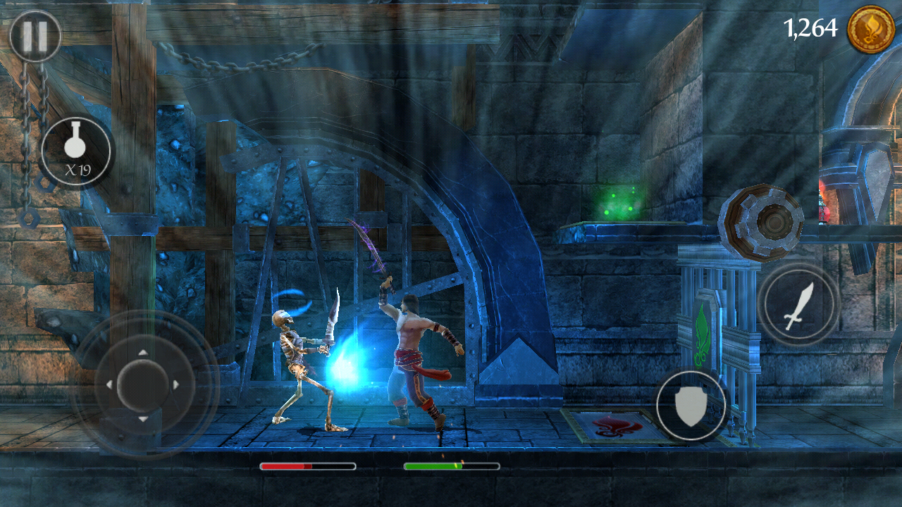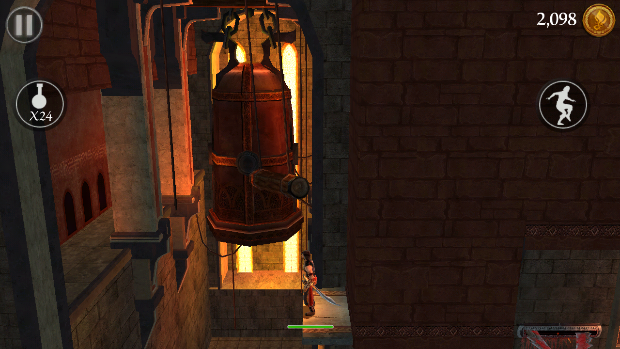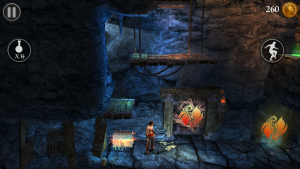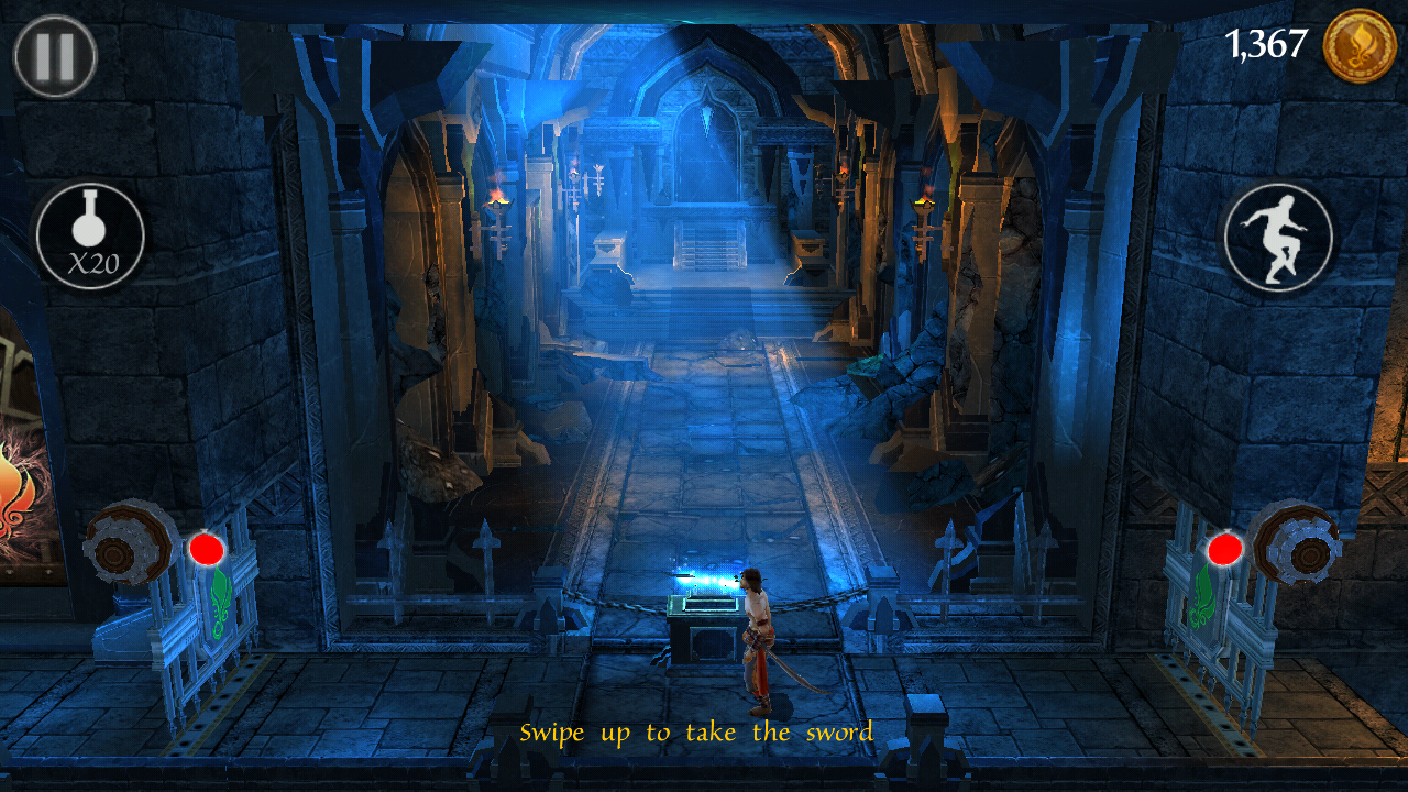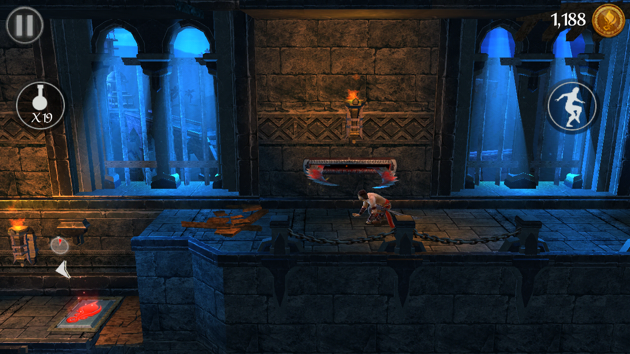 The controls offer both options from the predecessor, but the default setting is a gesture system that feels much more naturally on touch screen devices. On the left half of the screen, you simply make a gesture in the direction you want to go, while swiping up or down on the right side makes the Prince jump or crouch. This has its own issues with the distinction between upward and forward jumps, but otherwise it’s very intuitive.