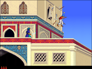 At the end of Prince of Persia, it looked like the Prince and Princess would live happily ever after, but the Vizier pulls some nasty tricks by disguising himself as the hero, and attempts to take command of the country by tossing him in the dungeon. Not willing to sit down and let himself capture like he did last time, the true Prince grabs a sword, jumps out the nearest window and begins his quest to uncover the Jaffar’s scheme, once again. The story is told through still cutscenes and full voiceover, which was pretty impressive for a floppy based game. There are even some impressively animated sections where the Prince rides his magic carpet through the skies or brings a horse statue to life.