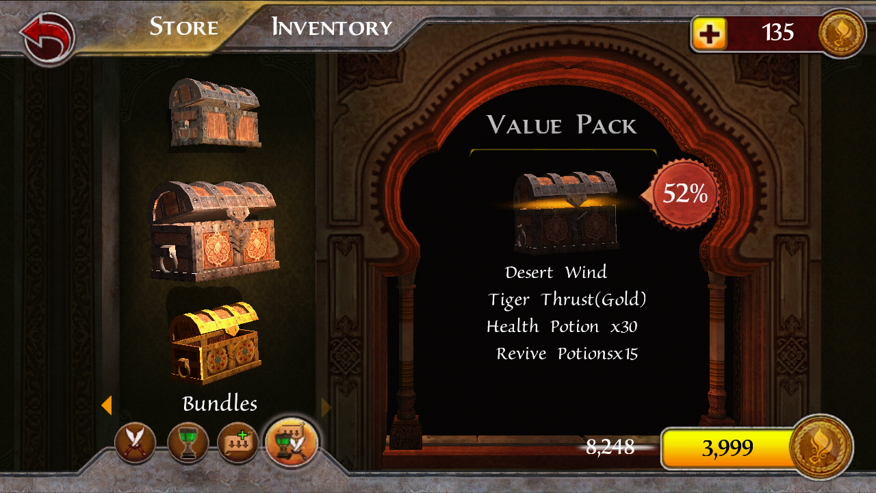 The prince gains several stronger swords throughout the adventure, but the most powerful weapons and upgraded combos must be bought with gold coins that can be found in levels or gaine from defeated enemies in small quantities. The game is designed in such a way that you probably won’t get all upgrades from a single playthrough, but the combat is so easy none of the items are really necessary. By the end of the game, it’s not unusual to have about 50 healing flasks left.