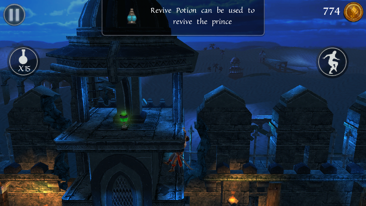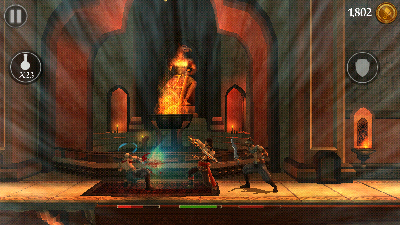 Ubisoft Pune also added a half-assed stealth mechanic to the game. If an enemy turns his back at the Prince, you can hold an icon while walking forward to sneak up towards them for an instant kill. However, the process is so slow and keeping two touch points held is so annoying that it’s usually more convenient to just head into an open fight.