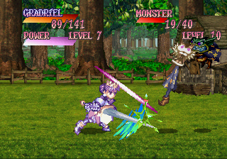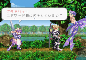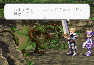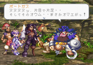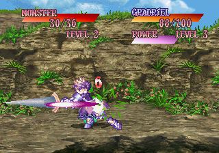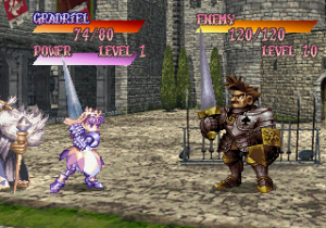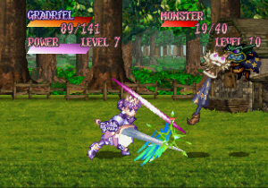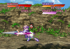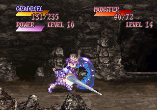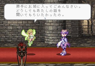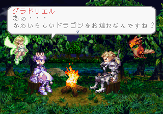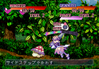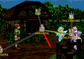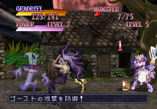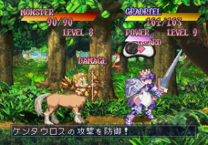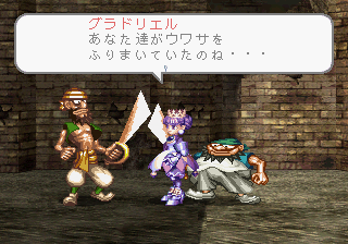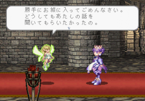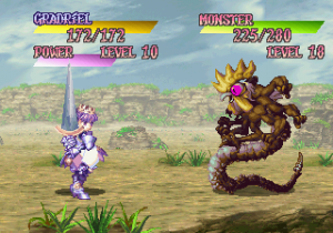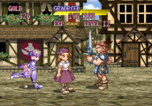 The kingdom of Valendia consists of several towns, along with your standard castles and caves. Each of these locations is connected by straight pathway. Whenever you reach the end of a path, you’re given a choice of your next destination, if the path branches. This allows free exploration of the kingdom without having to deal with menus or map screens. Your characters aren’t exactly speed demons, and even when running, travelling between destinations can be extremely slow. Thankfully you can travel between certain towns through the use of magical transportation shops. The storyline is pretty linear, and requires that you talk to as many villagers as possible, since that’s the only way to open up new locations on the map. Thankfully, any time you learn of a new location, the text is colored, which definitely helps if you’re not fluent in Japanese, and there are detailed FAQs that point you in the direction. There are a number of subquests that involve branching off into different directions, some of which allow you to create more powerful items or make certain boss fights easier.