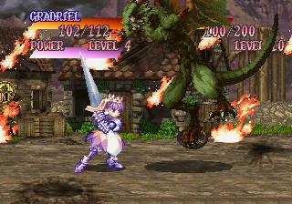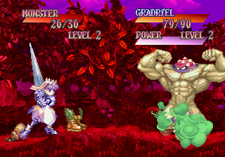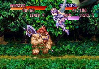 Princess Crown earned its reputation by featuring some of the most gorgeous 2D graphics around. All of the sprites are huge, with most taking up roughly half the screen, and all are meticulously animated. These effects are most apparent with the dragons, who flap their wings and breath so fluidly that it makes practically every other 2D effort look cheap. It’s not quite to the levels of Street Fighter III or Garou: Mark of the Wolves (still the highest levels of 2D sprite animation), but it comes close.