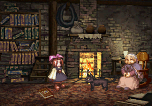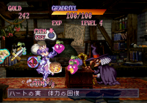 The game seems to acknowledge the weaknesses of the fighting system, because healing items are fairly plentiful. Some enemies randomly drop half-eaten cupcakes and hamburgers, most dungeons have numerous treasure chests, and a few areas even have hordes of apples growing on trees, a quick and easy way to restore your health. Your life meter is generously refilled every time you gain a level, which happens reasonably often. You can also plant seeds (although only in battles) which will not only yield health restoring fruit, but more seeds as well, allowing you to plant over and over ad infinitum. You’ll run across other items like spices and meat, which can’t be consumed normally, but can be cooked at various cafes to turn them into powerful healing items. It’s more than a bit aggravating to bring up your inventory and find that you can’t eat that piece of corn you found, because it hasn’t been cooked yet. (Both of these aspects were expanded greatly in its follow-up, Odin Sphere.)