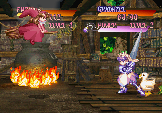 Putting space between yourself and your foe is one of the biggest issues you’ll have to deal with in Princess Crown, primarily due to the POW meter. You begin each match with your POW meter at 50%. It increases slowly if you walk around, although if you stand completely still, it’ll fill up faster. Almost any offensive or defensive action – attacking, blocking or dashing – drains a bit of the POW meter. It’s supposed to regulate button mashing by forcing you to back off from close encounters, lest you find yourself with zero POW, which essentially means you’re defenseless. The problem is that the POW meter drains way too quickly and doesn’t refill fast enough. This results in far too many situations where the enemy can get in multiple cheap hits – God forbid you get cornered, because your characters simply aren’t agile enough to escape most traps. At least your familiars will occasionally pop onto the screen and score some quick hits on your opponent, which can serve to save your butt from getting repeatedly beaten down.