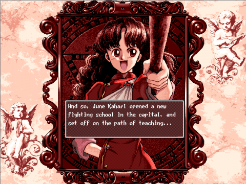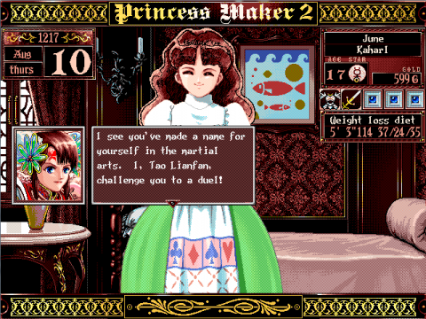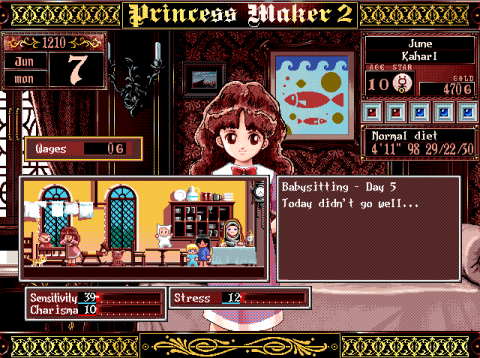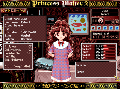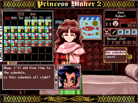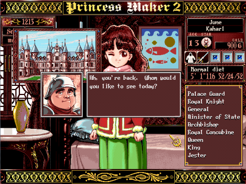 Princess Maker 2 sets itself in a medieval European fantasy world, where Lucifon (aka the devil) has come around to punish mankind for their arrogance by destroying the major kingdom of the land. This is when your character steps in, a warrior from another land who becomes a hero that defeats the demon hordes. The king grants you work at his palace and promises to change his ways, while the heavens have bigger plans for you. They send you a child from the stars to raise, a young girl who has the potential to be a great hero like yourself and set humanity on the proper path. What happens from here is up to how you raise the young girl, and the endings range from heart warming to horrific.