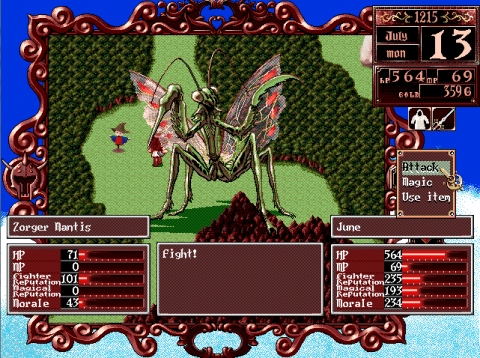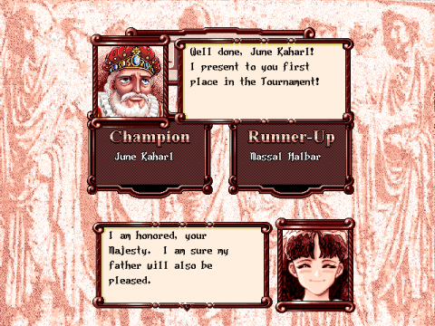 You start the game off by naming the hero and the daughter, while also deciding the daughter’s birthday and her blood type, which affects variables that change her stats. You raise her from age ten to age eighteen, sending her to do different jobs as the main breadwinner (your allowance is yearly) and learn a variety of skills from different schools. You can also visit the court to try and meet different high ranking officials and gain clout, visit shops in town for goods, and go on adventures in four different dungeon areas, each with their own special events and secrets. There’s also other special events, like the harvest festival contests, getting visits from different deities of different fields, meeting with salesmen, gaining a rival, challenges in the streets, and much more.
