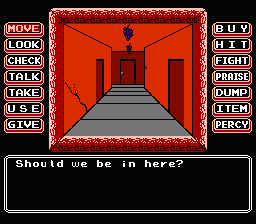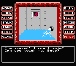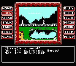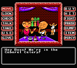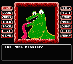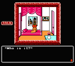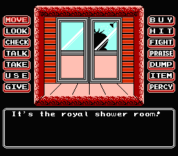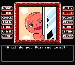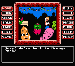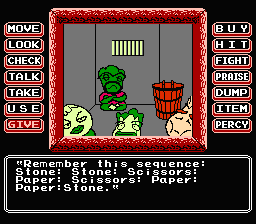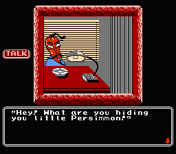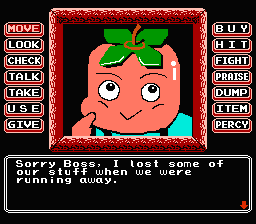 The story has been significantly overhauled, with a total of eight chapters versus four in the original. The first two areas are roughly the same, with a few new puzzles added in. One of the first characters you meet in both versions is an injured baby persimmon. In the computer version he just gives you some info, but in the NES version he’s named Percy and joins you, acting as a squire. In other words, he essentially takes on the role of Yasu from Portopia, that being a partner who relays information, since the protagonist is silent. He has his own command and is useful for puzzles, but mostly he just loses various (unneeded) items between chapter breaks and says lots of goofy stuff.