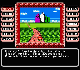 Most early text adventures were developed in America, where the genre was practically invented. Naturally, as they began to be exported overseas, the local cultures began to take the concept and run off in their own direction. In Japan, Hudson’s were amongst the more interesting, if only because the guys developing their titles were certifiably insane. (See: Dezeni World, a cracked out take on Disney theme parks.) Their most well known is Salad no Kuni no Tomato-hime, translated as Princess Tomato in the Salad Kingdom – it was also their only adventure game to be translated into English. The Salad Kingdom, as one might expect, is populated almost entirely by anthropomorphic vegetables. As the story goes, the evil Minister Pumpkin kidnapped the beautiful Princess Tomato, causing her father, King Broccoli, to perish out of grief. And so, the kingdom’s greatest knight, Sir Cucumber, sets off on a journey to save her.