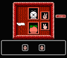However, the story takes a drastic turn once you leave Saladoria. In the NES version, you end up getting captured and escaping from prison, and exploring a second town called Sopville while disguised as the enemy. It hits most of the same plot points as the computer version, like when you take command of a gigantic robot called the Dice-o-Matic and face off against a monstrous mechanical watermelon. You also need to destroy a squad of evil bananas, using a sword in the PC version and a peanut bomb in the NES version. The NES game adds even more weirder sequences, like when you meet Princess Tomato’s sister Lisa, who is inexplicably a human despite living in land of (and being related to) anathropomorphic vegetables. And in a rather creepy scene, you even end up spying on a nubile young ornage in the shower. The NES port also introduces three maze sequences, as well as combat sequences which take the form of Rocks-Paper-Scissor battles, here dubbed “Finger Wars”. While most of the additions in this port are welcome, these feel a bit too shoe-horned in, like the developers felt like a straight adventure game wasn’t meaty enough and it needed some light RPG elements.