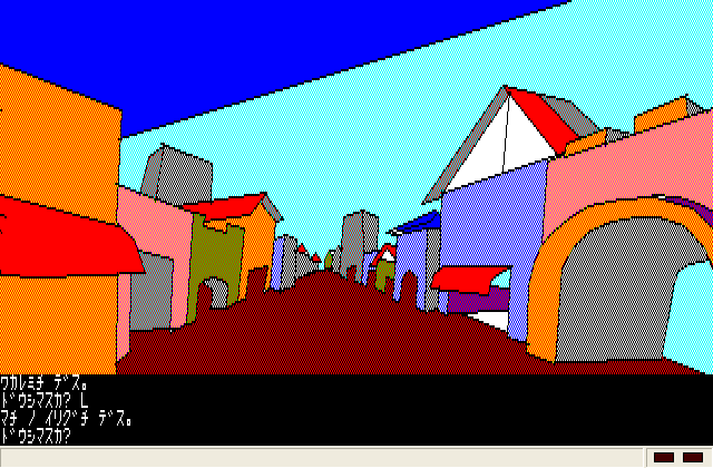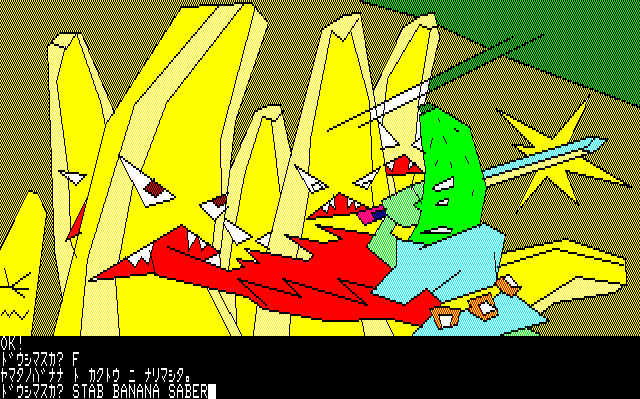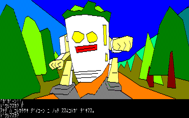 All user interaction in the computer release is handled through a text parser. While most of the text is in Japanese, input is understood in English text; the “look” command is kind enough to translate all objects into English so they can be easily interacted with. The parser is extremely basic though, and can’t even handle prepositions, so a command like “hit watermelon with tree” will need to be typed as “hit watermelon tree”. And strangely, while most English text adventures required that you use the cardinal directions for movement – (N)orth, (S)outh, (E)ast and (W)est – Hudson’s games instead use (F)orward, (B)ackward, (L)eft and (R)ight.