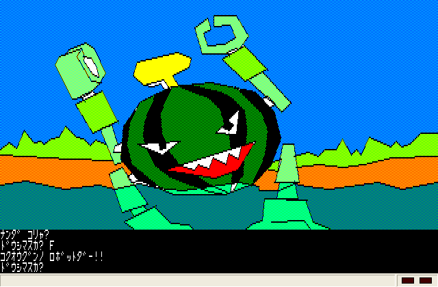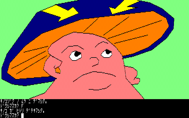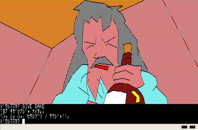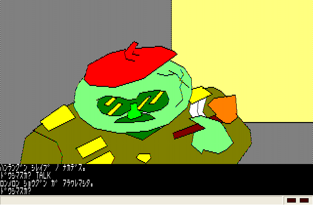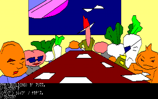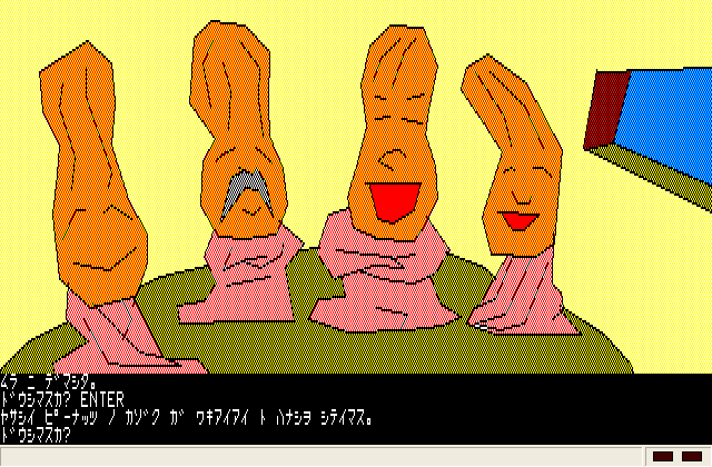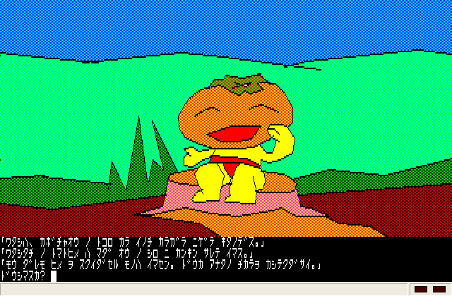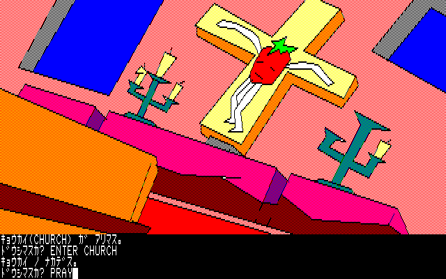 The game was first released on several Japanese home computers, including the Sharp X1, MSX, and PC-88. The PC-88 version is by far the best looking, with colorful, high resolution graphics. The artists at Hudson were totally brilliant, and while the angular lines make them look like fancy MS Paint drawings, there’s such a goofy sense of style that it’s utterly compelling. The most amusing are the ample bosoms stuck on the vegetable ladies, and the crucified strawberry in the church. Despite its age and although it’s restricted to a 16-color dithered palette, it’s still an incredibly bright, attractive game, and visually is leaps beyond most English text adventures of the time.