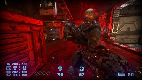 Helping with this is the game’s style. At default, Prodeus uses a sort of pixel filter alongside simplistic animations to make every enemy look like a monster from the earlier years of the FPS, just cranked up on modern hardware. It’s like Doom 64 on steroids, with a cool red and blue centered color scheme to further feed you information on what enemies are around. Some effects can be a bit much, like the pixel smoke and the after flash of the plasma gun at close range, but its otherwise quite readable and exciting. It’s sort of like a 90s The Web sort of look was lightly coated over the Doom aesthetic, and it really works, especially with Marathon and Halo style grand architecture at spots. The sheer amount of blood and viscera is also greatly appreciated, and somehow never manages to get in the way of the action.