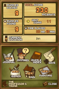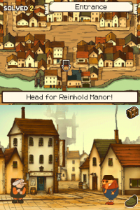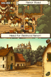 The core gameplay of the series is the numerous riddles you must solve in order to progress; indeed, the number of puzzles in the game is featured prominently on the box art of games of the series (and the European box art of this one). In classic ADV game fashion, you are presented with a first-person view of an area, and must click on a part of the scenery or a character, often triggering a puzzle that you can attempt to solve. Puzzles are self-contained, with instructions in the top screen; you solve the puzzle using the stylus in the bottom screen. Some puzzles are needed to advance the narrative, but most aren’t; however, the game gates your progression at some points, telling you you can only move forward after having solved e.g. 50 puzzles. You are thus strongly encouraged to look around and talk to everyone to get and solve as many puzzles as you can. Should the story progress and leave some unsolved puzzles behind, you have the opportunity to visit Granny Riddleton’s shack, that holds all the puzzles that are not available in the village anymore, in order to complete them. That being said, for the completionists out there, it is still not easy to find 100% of the puzzles, as some will be available (but missable) until the very end, which means they never appear in that shack; the purpose of the shack seems to be to ensure no player gets stuck in a situation where there’s not enough puzzles left to solve in order to pass the next gate.