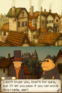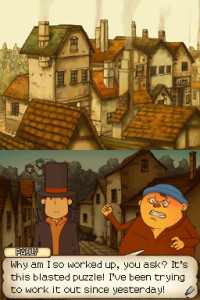 The characters in the game are not much to write home about; they are all rather distinctive and each have their own energy, but don’t really have anything going on besides that, and will mostly be sources of puzzles. (There are about two dozen characters, overwhelmingly male, and you won’t get to know them more than “perpetually angry man” or “odd-looking tourist”.) Actually, if we’re being honest, the Layton character himself isn’t an amazing main protagonist. We know exactly two things about him: that he is the smartest person in the room, and that he is a gentleman (to make him likeable, perhaps?). He always keeps his composure and cools conversations down, which makes for a protagonist with no real flaw, no real emotion shown, no secret, and no motivation besides puzzle-solving. Sherlock Holmes is a dysfunctional grumpy man, Hercule Poirot is overly proud of himself, Phoenix Wright is full of passion for justice, but Layton is just… there, cool as a cucumber. That’s a shame, as a protagonist with more color and texture would have opened more narrative opportunities and made for a richer story.
