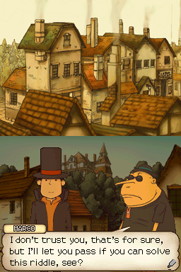 In the end, Professor Layton and the Curious Village is a very interesting concept, mixing two rather separate genres in a unique way. The puzzle-solving aspect is very nicely done, apart from a few quibbles, and exploits the DS’s capacity very nicely; if you like puzzles and brainteasers, this will keep you thinking and entertained for over a dozen hours. However, while there was obviously a lot of effort put into the presentation, the game doesn’t quite gel as a narrative experience or an adventure game; the characters aren’t very deep or interesting, and the writing isn’t particularly good, while the story just exists to move the player along. The strong core gameplay makes the game, but it will be interesting to see how the series progresses on other aspects.
