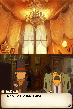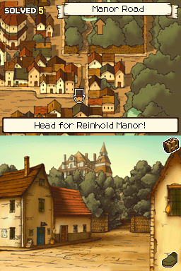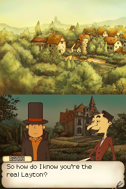 The art style is also a patchwork with some Japanese influences; although Layton’s design is simple and very much in the ligne claire style, and the atmosphere and architecture are clearly European, Luke looks like a youthful wide-eyed shonen protagonist. The half a dozen cutscenes, which are triggered during important story moments, are very well-done, but done quite clearly in the Japanese style, which is especially visible in the chase scenes (in which the characters run like in Lupin III). The character art in general is a bit of a mixed bag; important characters generally get expressive but realistic sprites, as some secondary characters do, while others are striking in their oddity and roughness (bulging eyes, extremely defined lips, odd head shapes, etc) in a way that somehow feels very Japanese. (There are also a couple of unfortunate stereotypes in there.)
