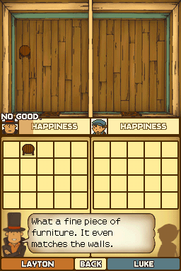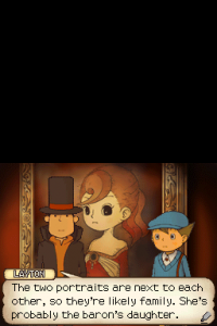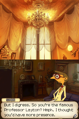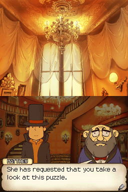 One of the main narrative hurdles that comes with the bold attempt of mixing two genres so separate (the mystery ADV game and the casual brainteasers) is to try to weave the puzzles into the world and the story. On this point, the game unfortunately doesn’t succeed. The first couple of puzzles are integrated with the story, but not a lot of them are afterwards, and the justifications for the puzzles in the story quickly become either “I’m stuck on this puzzle and it’s keeping me up at night!”, “So you’re Professor Layton? Let’s see if you’re as good as your reputation!”, or “A flower? Luke, that reminds me of a puzzle”. (And each of these justifications is used so many times you get sick of it.) The game is aware of that, and tries to use humor to deflect it (with Layton and Luke saying “Really, right now?!” in a couple of the worst offenders), and also tries to weave it in the setting and the story. In both cases, this comes off as meta, which isn’t the strongest justification writing-wise, more like a deflection; and since it’s the first game of the series, one can rightfully wonder how the series is going to keep this up and keep justifying the hundreds of puzzles in the story. The problem is compounded in the case of the mini-games, which require you to collect furniture or pieces of a painting; while the first thing you collect is integrated to the story, with characters setting up the mini-game or reacting to it, the rest are just random drops after you solve a puzzle, which can feel a bit tacked-on. (It just doesn’t make sense to get a sofa after Layton tells his favorite puzzle to Luke.)