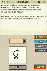 Overall though, the puzzles are a good mix, fairly diverse in their setups and the skills they require. They are also well spread out difficulty-wise. The difficulty of a puzzle is given before the puzzle starts by the number of points (or “picarats”) awarded for solving it, which is a very good idea; these run between 10 and 80, in increments of 5, and overall the number of points matches closely the difficulty and time needed to solve a puzzle. Having such a good and varied indicator allows the player to think things like “this will take me too much time, I’ll solve it later” or “this is a hard one, it’s ok if i don’t get it”, which is a very good thing, allowing to accommodate players of different skill levels. The puzzles also can be tried as many times as one wants; each of the first two incorrect guesses lowers the picarats value of the puzzle, but it never drops very low, meaning that even a player who gets it wrong frequently will still rack up points, which is a nice touch for novices.