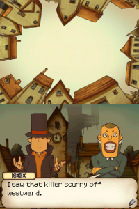 The story itself unfolds under the eyes of the player in a series of story beats that the player finds while finding clues. It is meandering; you start by looking for a treasure, but you don’t find any clues and get sidetracked by some things (because, of course, there is a murder, and a grumpy inspector that looks down on Layton’s attempts at investigating), until it all falls into place and all the mysteries you encountered get solved. All the player has to do is follow the next objective to unlock more of the story – there is no need for deductions or dialog tree traversal in the game, which also means the story isn’t very tight or follows logical deductions. It relies generously on Layton’s intellect to move the story forward, in which he gets an intuition about what the next plot beat is, or makes a deduction that is a little far out. And although the game is styled after European crime novels of the 20th century, which usually presented a case with impossible facts that were then explained through logic alone, ultimately here the explanation of the mystery relies on Japanese-style magical realism (just as there are mediums in Phoenix Wright) and some emphatic symbolism. All of this could be disappointing if you’re expecting investigations and deductions, but since the game doesn’t brand itself as an investigation game and the story isn’t a gameplay goal of the game (solving the puzzles is), this is fine. We do get as a consequence a nice story and some very striking visuals, such as the tower made of piled-up houses at the center of the village (or the, uh, Dr Robotnik-style baddie and his massive ship).