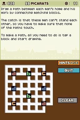 The puzzles themselves all fall in the brainteasers category, the ones you find in children’s magazines, logic books, etc. In fact, most of them were taken from a popular Japanese series of books by Prof. Akira Tago (Head Gymnastics) featuring hundreds of these over twelve books. However, some of the puzzles (like the sliding blocks puzzles) are original puzzles that were created specifically to use the Nintendo DS’s stylus, and these are actually very nicely done with intuitive controls. The puzzles are of numerous types: pure logic, observation, spatial/visual reasoning, manipulation, mazes, geometry, mathematics, etc. There are no language-based puzzles however, or any based on cultural references, for translatability. Because some puzzles require mathematical reasonings that are a bit abstract, one cannot really recommend this game to children younger than 10. Some of the puzzles might be new to you, but unfortunately there are some really old chestnuts in there, the kind you’re already seen too many times if you like brainteasers: “measuring 4L with two containers of 5 and 3L”, the eight queens problems, magic squares, the wolf the sheep and the cabbage, things that double every minute, the liquid costs 100$ more than the container, etc. There is also the issue that the instructions, contained in the top screen of the DS, are sometimes a little ambiguous (including for the last puzzle unfortunately), which is a shame. Finally, the game also adds three mini-games that require you to collect parts or furniture for a room, which you sometimes get as a reward for solving a puzzle; these games are here to incentivize solving more puzzles, but are definitely on the easy side and won’t keep you busy for very long.
