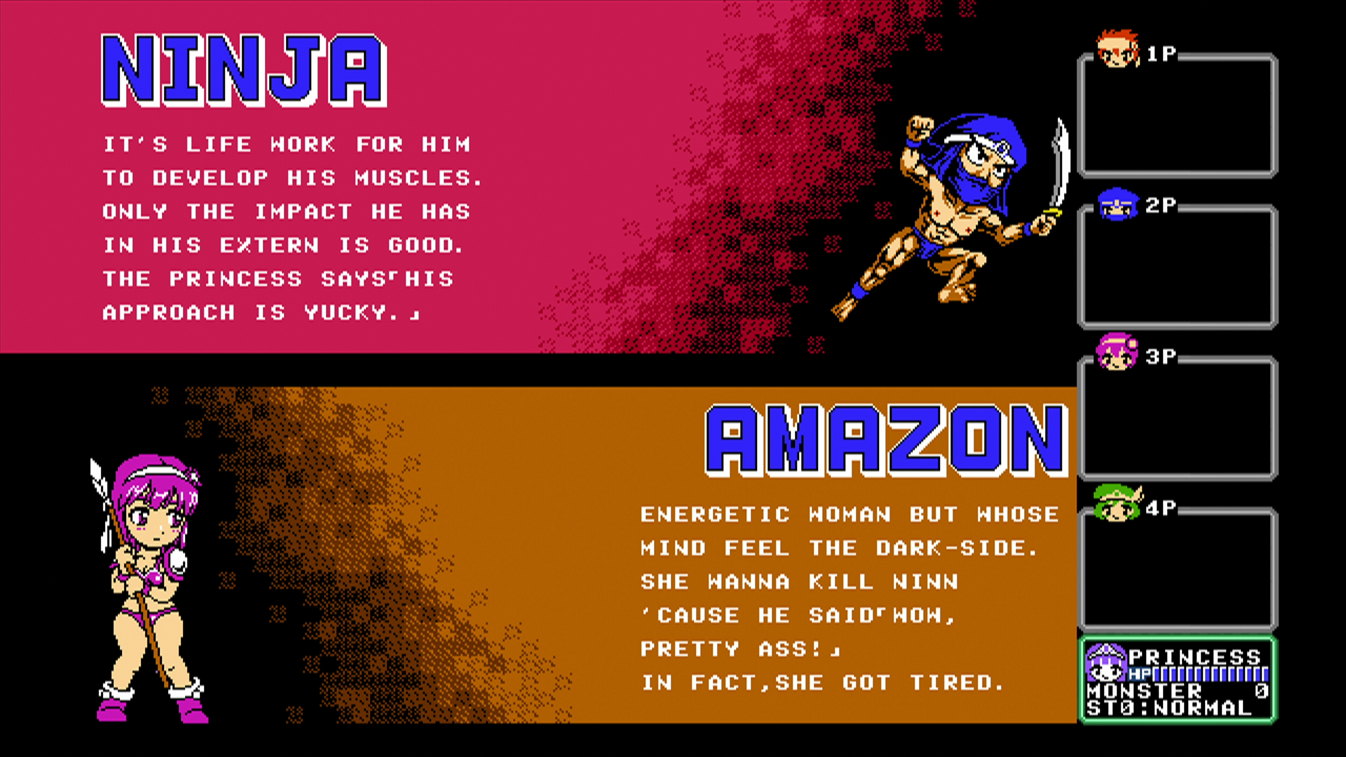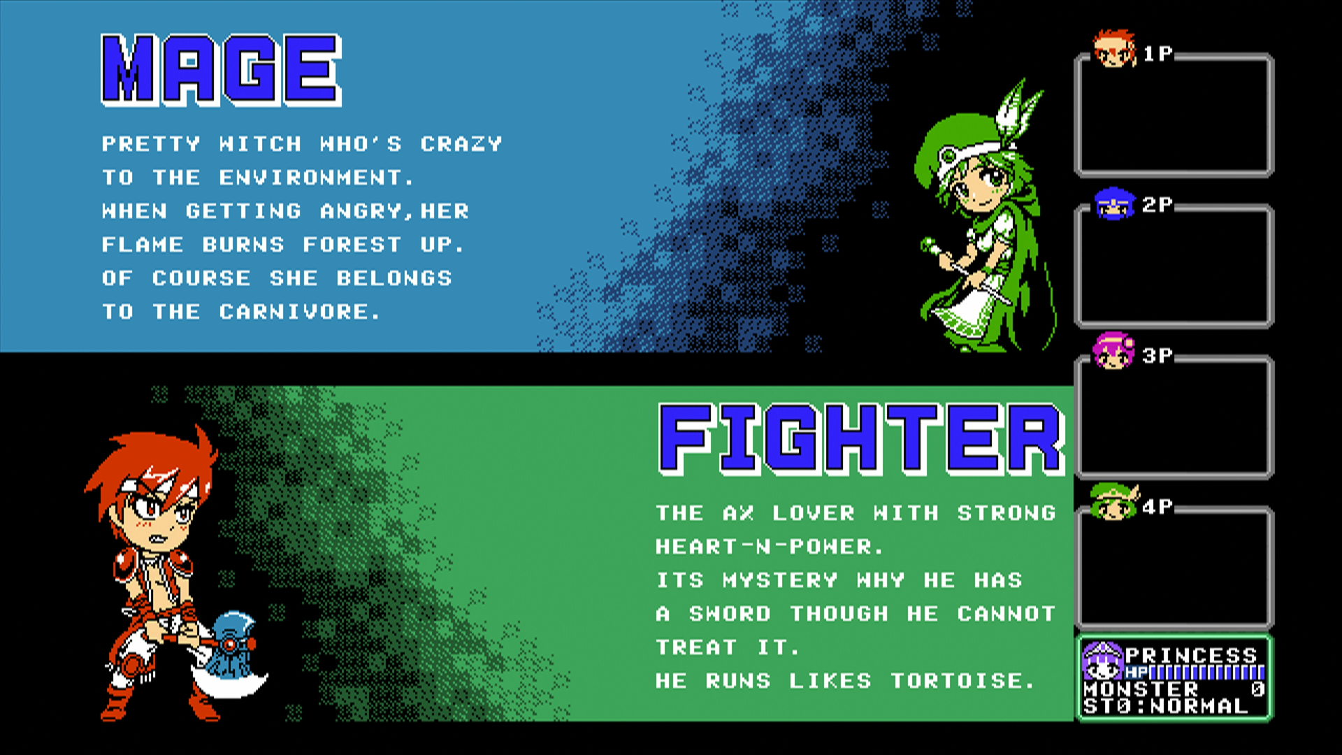 The visuals may look simple but show a remarkable amount of personality. The Princess proclaims “Defeat F@*#in Goblins” on the title screen, and much of the game’s tutorial text is written in authentic Engrish. Even the small comic stills on the stat upgrade scenes show a remarkable amount of character despite having very little text. The music is all by Yuzo Koshiro (he co-founded Ancient, along with his mother), and it’s all delightfully silly NES-style chiptunes.