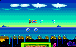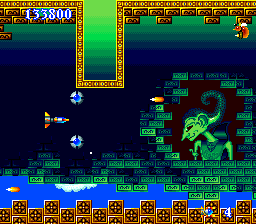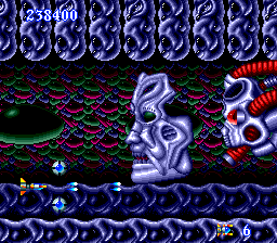 The first level is the most well designed, again keeping structural similarities to R-Type, complete with a snake that weaves throughout the stage. Later levels aren’t as skillfully designed – they’re never bad, but they lack distinction. Technically most of the stages are relatively easy, but only as long as you don’t get killed. Dying will send you back to a checkpoint, and good power-ups are rare. There is a shield power-up, at least, which can absorb a number of hits. Bosses are troublesome too, and while their patterns aren’t difficult to figure out, your weapons aren’t really all that powerful even at full strength, and the bosses can absorb a lot of damage, at least until you figure out a trick to do damage quickly (which mostly involve getting close and using the orbs).