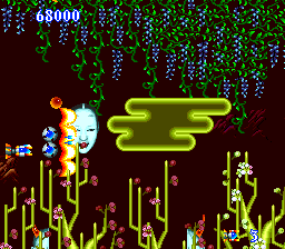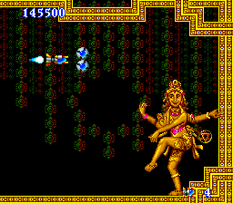 Subsequent levels occasionally have loose themes accompanied by really bizarre visuals. One stage is loosely themed around Japanese culture, with a mid-boss that switches between a Noh and an Oni mask as it takes damage, and the level boss being a white seven tailed fox. Another has a loose Hindu theme, with foes based on the elephant deity Vishnu and the multi-armed Shiva. The final boss has a weird-looking mask that detaches itself from an even weirder looking face. Even though the enemies are strange, there really isn’t a large variety of them.