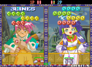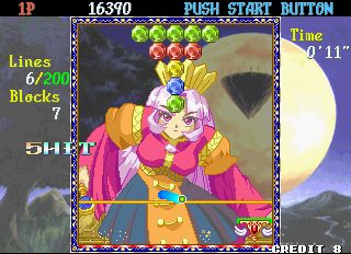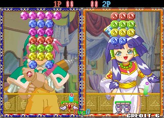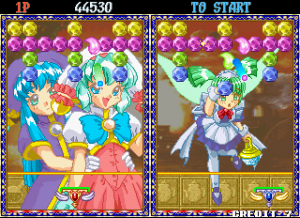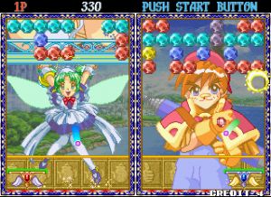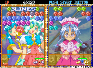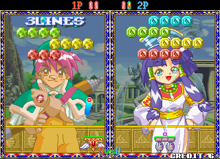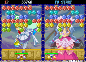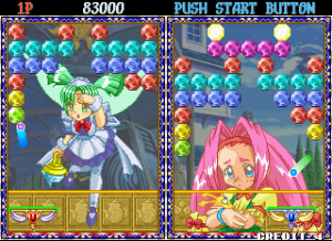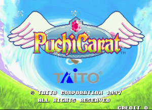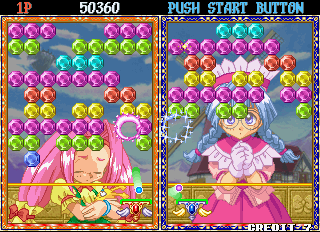 Taito’s Puchi Carat fuses two of the company’s titles, combining the brick-breaking of Arkanoid and the competitive action of Puzzle Bubble. The player controls a paddle, launching it at a screen full of gradually descending multicolored gems (named “stones”) to clear them from the screen. Combo fuel comes in the form of “roots,” the stones which connect those below them. Breaking off large swathes of stones will cause them to fall off the screen, as in Puzzle Bobble. When battling opponents, these severed stones will generate grey variants which will litter their screen and obscure their shots. A large amount of dropped stones will also lower the screen with more rows of stones. Sparkling “shiny stones” will clear all stones of their corresponding colour, with the lurid “all clear stone” destroying everything on-screen. Hard stones require two hits to remove, whilst the aptly titled, golden “annoying stone” can only be removed by its roots.