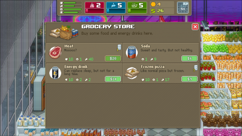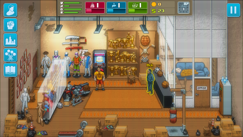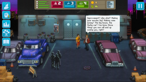 If you grew up in the days of arcade gaming, you are going to adore this game’s style. It helps the core design is great. The focus is on building your fighter and managing their fighting life with basic necessities and side quests. You have to keep track of your health (affects how much of your max hit points you have in fights), hunger (which stops you from doing anything when low), mood (because you can’t do anything well when sad), and energy (self explanatory). If one drops too low, it becomes incredibly difficult to do much of anything. On top of that, you need to earn money to eat (though Mick will give you a small amount of free meals early on), use the gym, and buy equipment for your house, among other additional things. Everything costs time, and going around with a lot of cash on hand may draw the attention of thugs, and some are ridiculously strong.