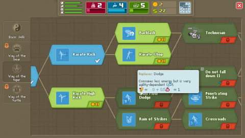 On top of this, you have four skill trees that you unlock skills and perks on with points earned from fights you win or lose. The first has basic skills, but at a certain point, you can unlock the other trees for Tiger, Turtle, and Bear, which all have specialized abilities and perks for the build, like Tiger’s tree containing a punch move that drains energy, and a perk that can increase your agility in a fight when at low health. This is where most of the customization lies, as the abilities you have for battles and the perks you gain can have massive effects on the outcome of fights. It’s more than just doing damage, you need to focus on a single strategy for your character and build them with that in mind to make them as effective as possible.