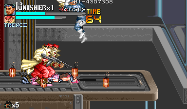 After ex-Marine Frank Castle had his family killed in the crossfire of a mob war, he’s dedicated himself to killing every criminal he can find. He’s now after the Kingpin, New York’s biggest crime boss, and Frank’s violent quest will take him on a cross-country rampage. Joining him as Player 2 is Nick Fury, special agent of SHIELD and no slouch in kicking ass, himself. In a nice touch, both characters have different dialogue whether they’re alone or together, and a co-op playthrough has Fury complaining constantly about the Punisher’s methods. There’s also some brief cutscenes between stages, none of which are particularly necessary, but do enough to provide context to things.