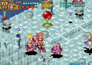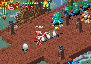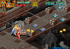 Each character has two attacks – a standard projectile attack and a melee weapon. You’re also accompanied by a familiar throughout the entire game. At first, it’s just a walking egg, but as you progress through the game, it hatches and evolves into different forms. What kind of create you get is determined by whether you prefer ranged or melee attacks. Considering that this is a short-lived arcade game that can be beaten in about twenty minutes, this does add a little bit of replay value. Each of the characters also has some kind of special form they can turn into – Clara can turn into the bikini-clad skater from the fighting games, and the two other characters have unique forms as well.