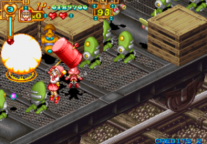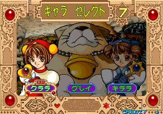 The magical girl Kurara was so popular that she ended up starring in her own game, dubbed “Prikura Daisakusen”. (“Prikura” is a contraction for “Kurara”, but it’s also the name of those photo booths which are very popular with young girls in Japan. This, in turn, is short for “print club”, and was invented jointly by Sega and Atlus. “Daisakusen” means “battle plan”.) It’s an cutesy action/shooter, similar to games like Commando or Mercs, except from the isometric viewpoint. You can choose from one of three characters – Clara, her partner Kirara, and a giant cat named Grey, who is actually a cursed prince.